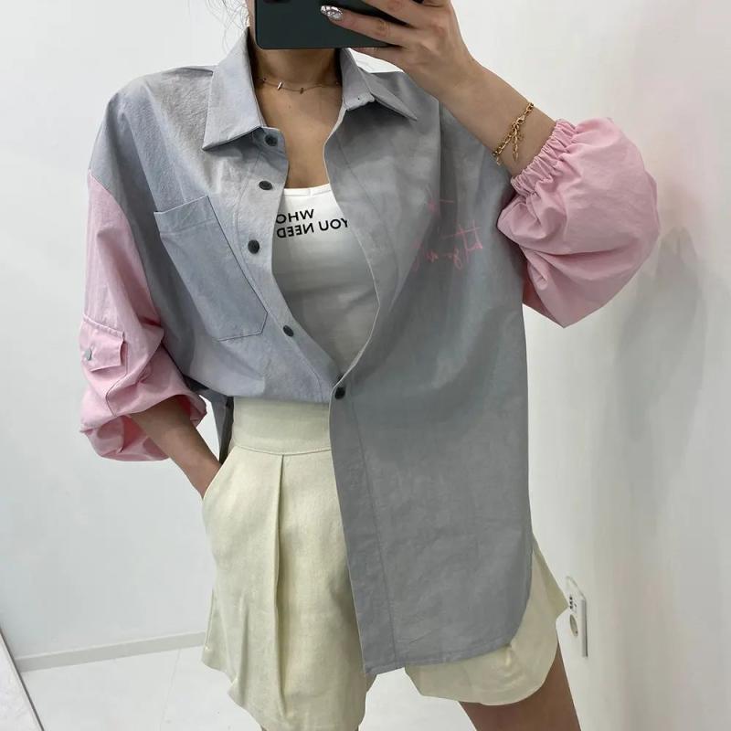 배색남방 아우터남방 오버핏남방 유니크남방 꾸안꾸세트 핑크핑크 봄남방코디 히히 40대여자 거울샷