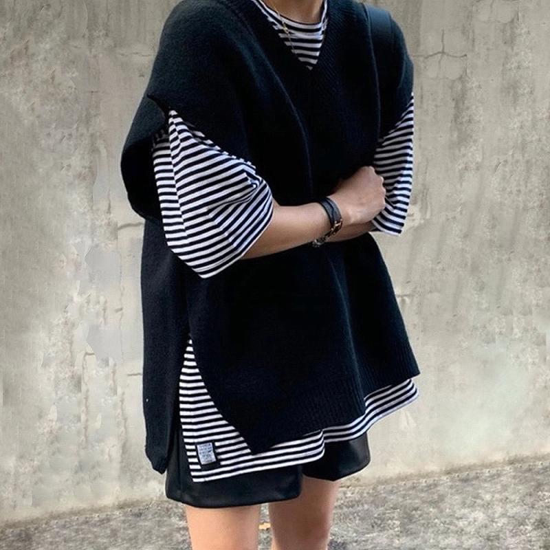 스트라이프 나시 이너 민소매 니트 조끼 코디