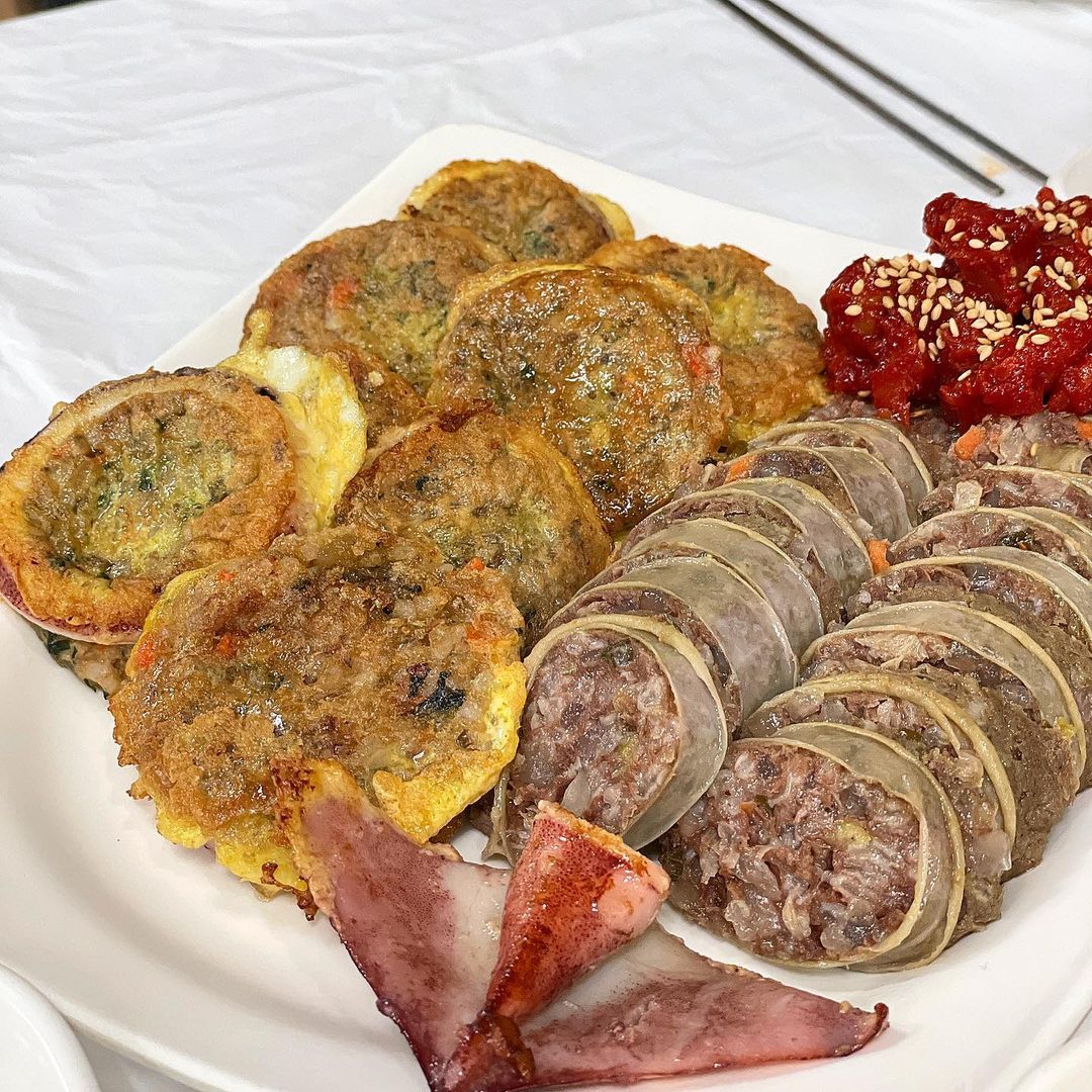 오징어순대는 쫄깃하면서 속이 꽉 차있다. 겉은 계란이 입혀져있어 부드럽다. 짭짤한 깻잎에 부드러운 명태회를 오징어순대와 싸먹으면 최강조합이다.