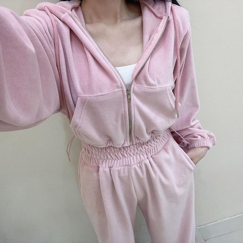 꾸안꾸 벨벳 크롭 후드집업 트레이닝 세트
