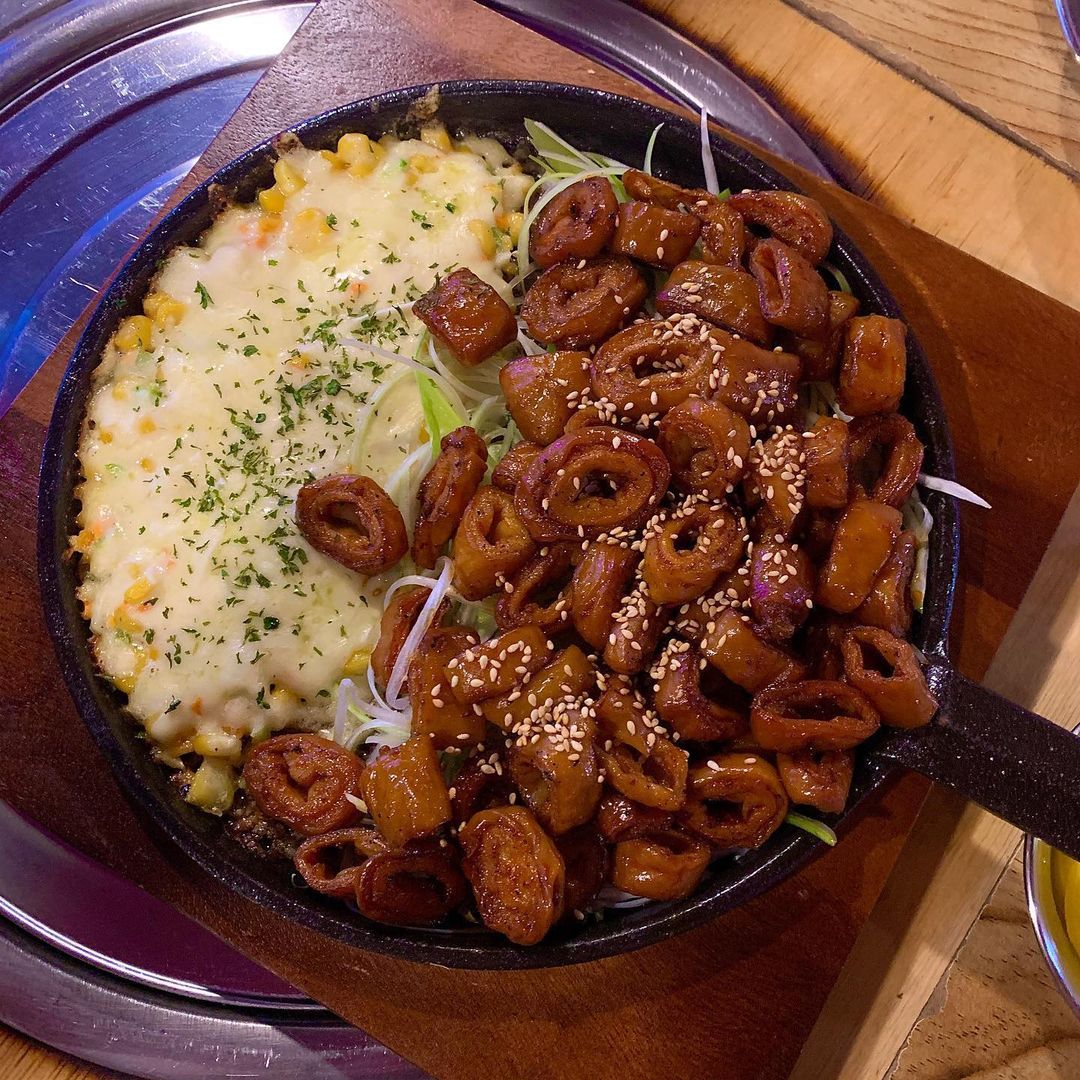 막창이 나오기 전에 양은냄비에 어묵탕 하나를 주는데 국물이 짭잘하고 진한 안주였다. 소금막창과 불막창 모두 옆에 치즈토핑이 잔뜩 깔려있었다. 콘치즈와 거의 유사한 구성이다. 사이드로는 날치알 주먹밥과 계란찜을 주었다. 양이 꽤 많아서 좋았다.
