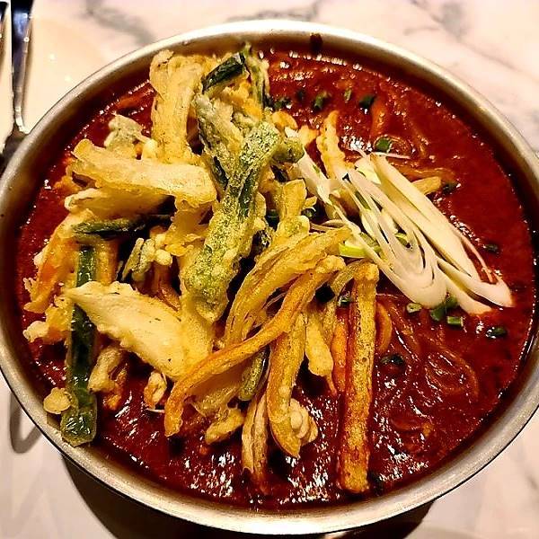판교 아브뉴프랑 1층에 위치한 인도음식점 인디테이블. 저녁에만 판매하는 인도퓨젼떡볶이인 스파이시 우삼겹 떡볶이커리. 딱 나오자마자 소주 생각이 훅 든답니다. 인도식 커리 베이스와 한국의 매콤함 (레드핫칠리페퍼 커리용)에 우삼겹과 야채튀김이 올라간 퓨전음식이라고 할수 있답니다. 딱 향도 맵고 비주얼도 아주 뷰티풀하답니다. 야채튀김도 주로 파프리카와 양파로 되어있는데, 의외로 떡볶이랑 잘 어울리더라구요. 쫄면도 매운커리와 잘 어울렸고, 이 떡볶이를 먹으면서 맥주보다는 소주가 생각이 많이 날 정도로 아주 매력적이었답니다. 분당 살때 알았으면 매주 갔을텐데 분당 떠나고 나서 알게된 찐맛집이라ㅠㅜ