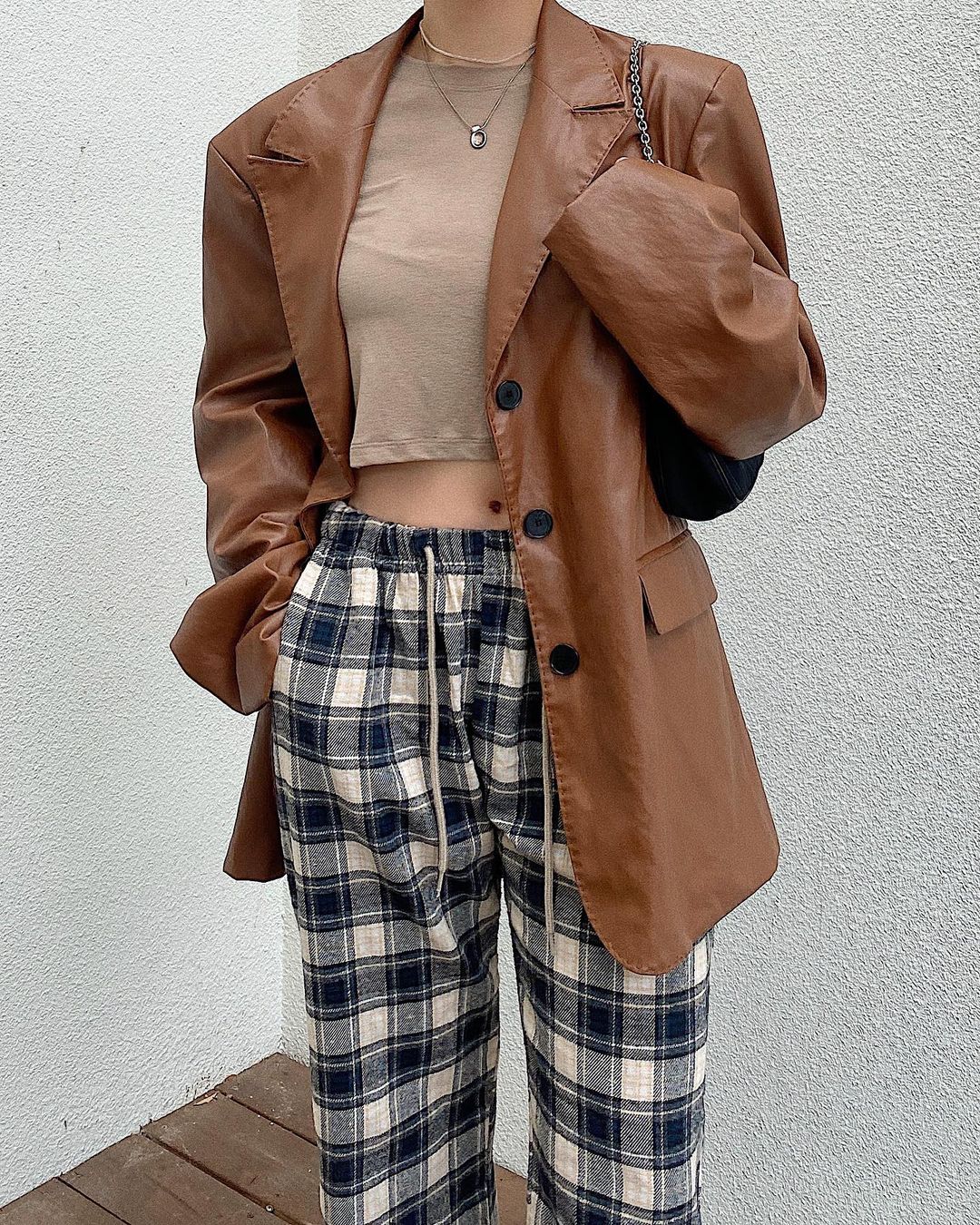 다띵마켓 클래식레더자켓 레더자켓 카멜자켓 레더카멜자켓 오버핏레더자켓 오버핏레더자켓은사랑 체크와이드팬츠 체크밴딩팬츠 체크밴딩바지 체크팬츠 카멜 체크체크 레더자켓코디 카멜레더자켓