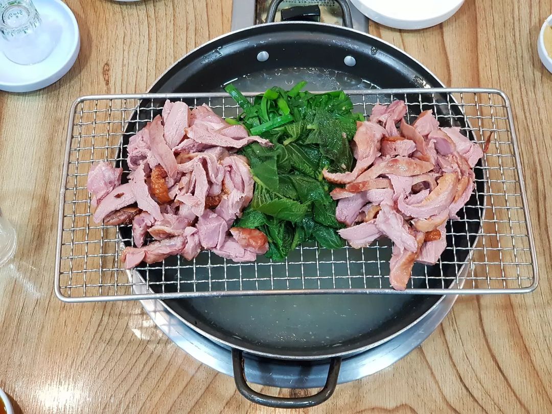 찾아보니까 훈제오리고기를 한번 쪄서 나오는 곳이더라구요? 깻잎이랑 부추도 같이 쪄서 나오길래 저도 버섯까지 추가해서 쪄 봤습니다🙂