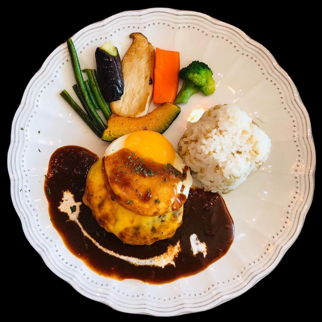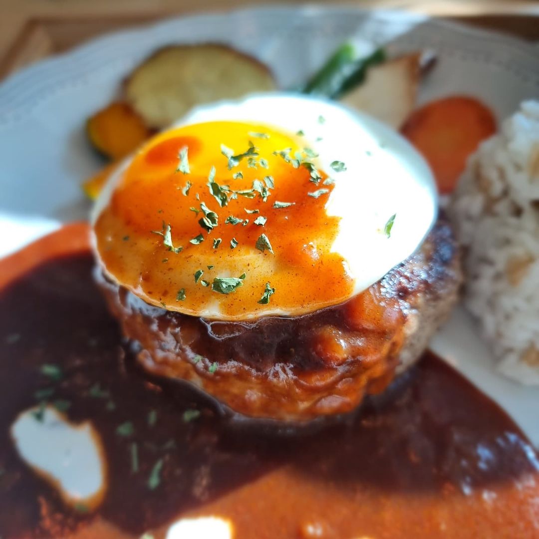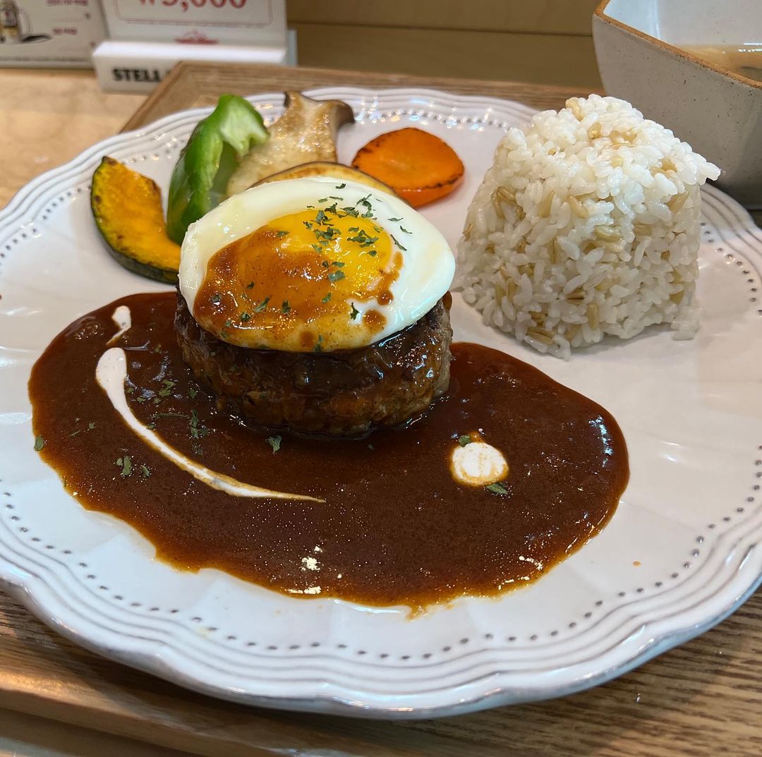 겉바속촉으로 잘 구워진 함박스테이크 위로 반숙계란과 새콤달콤 데미글라스 소스가 올라가 있다.