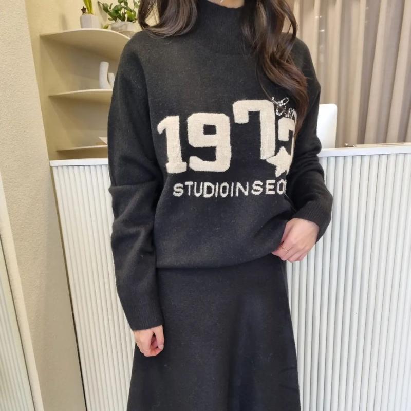 앞쪽 레터링이 부클사로 들어가 입체적으로 보이고 크리스탈 포인트까지 세심한 부분까지 신경쓴 니트입니다.