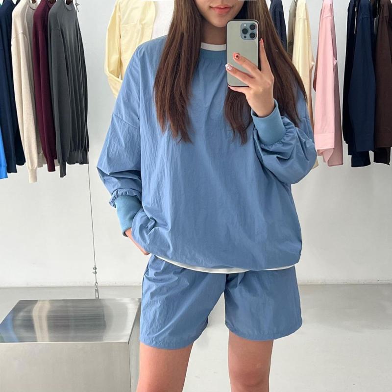저또한 컬러별로 가지고 싶지만 텅장인지라 최애컬러인 스카이로 만족중,,밑단 스트링이 적용되어 다양한 실루엣 연출 및 기장 조절이 가능하여 남녀 다 착용 가능합니다!! 현재 쇼룸에서 가장 인기있는 셋업 상품으로 고민은 실물영접만 늦을뿐🫢
